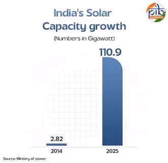 - Since 2014, India’s capacity to make solar PV cells has grown about 21 times, going up from 1.2 GW in 2014 to about 25 GW by March 2025.